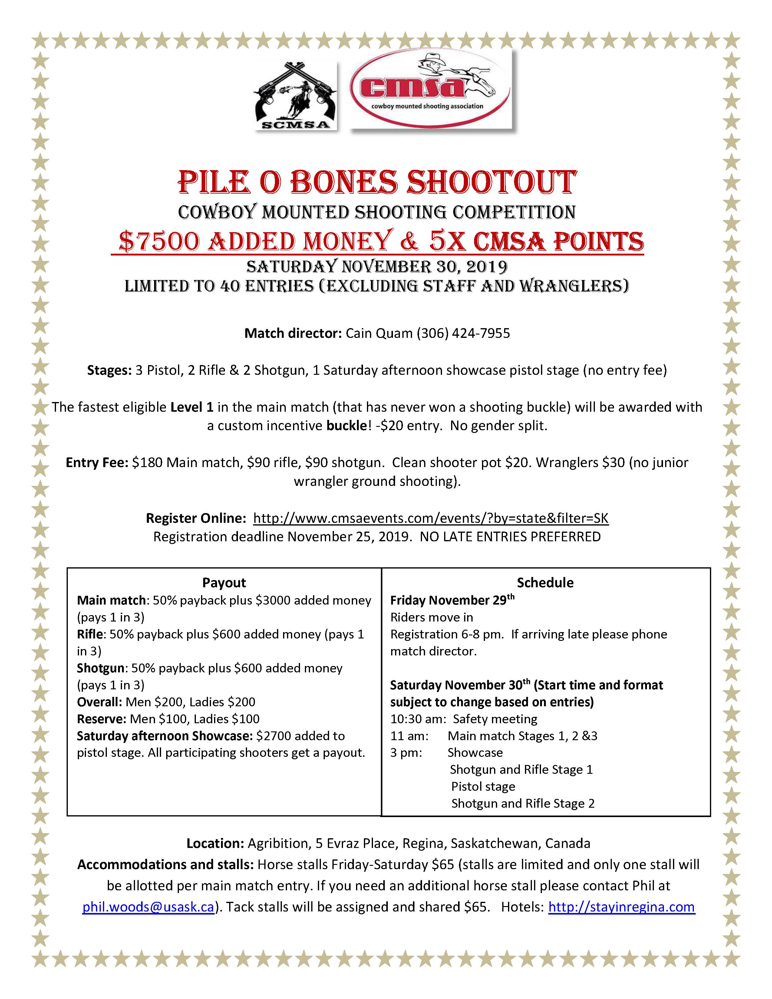 PILE O' BONES SHOOTOUT ***$7500 added money & 5x CMSA Points*** Limited to 40 entries (excluding staff and wranglers) Match director: Cain Quam (306) 424-7955 Stages: 3 Pistol, 2 Rifle & 2 Shotgun, 1 Saturday afternoon showcase pistol stage (no entry fee) The fastest eligible Level 1 in the main match (that has never won a shooting buckle) will be awarded with a custom incentive buckle! -$20 entry. No gender split. Entry Fee: $180 Main match, $90 rifle, $90 shotgun. Clean shooter pot $20. Wranglers $30 (no junior wrangler ground shooting). Registration deadline November 25, 2019. NO LATE ENTRIES PREFERRED PAYOUT Main match: 50% payback plus $3000 added money (pays 1 in 3) Rifle: 50% payback plus $600 added money (pays 1 in 3) Shotgun: 50% payback plus $600 added money (pays 1 in 3) Overall: Men $200, Ladies $200 Reserve: Men $100, Ladies $100 Saturday afternoon Showcase: $2700 added to pistol stage. All participating shooters get a payout. SCHEDULE Friday November 29th Riders move in Registration 6-8 pm. If arriving late please phone match director. Saturday November 30th (Start time and format subject to change based on entries) 10:30 am: Safety meeting 11 am: Main match Stages 1, 2 &3 3 pm: Showcase Shotgun and Rifle Stage 1 Pistol stage Shotgun and Rifle Stage 2 ACCOMODATION AND STALLS: Horse stalls Friday-Saturday $65 (stalls are limited and only one stall will be allotted per main match entry. If you need an additional horse stall please contact Phil at phil.woods@usask.ca). Tack stalls will be assigned and shared $65. Hotels: http://stayinregina.com