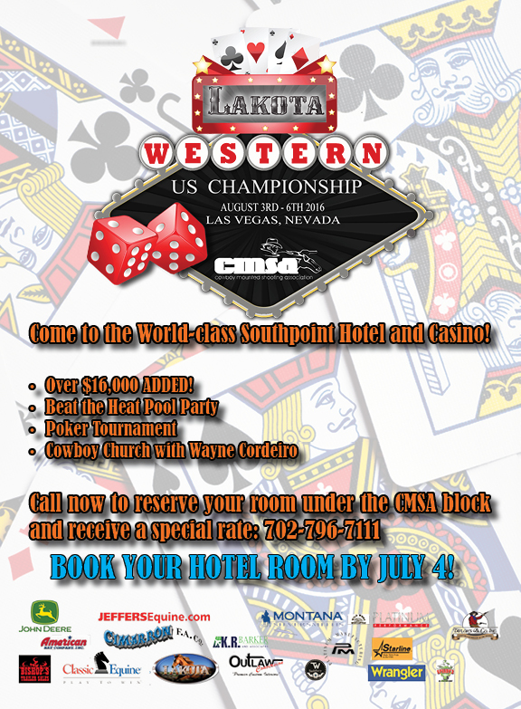 Book your hotel room by July 4! Call 702-796-7111 and mention you're with the CMSA Lakota Western Championship.